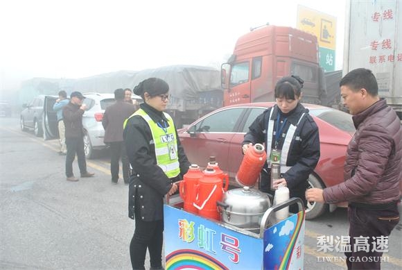 近日,江西境内大雾弥漫,梨温高速鹰潭西收费站笼罩在一片浓雾当中。7日凌晨1:20分,接到监控中心通知,鹰潭西收费站封闭,该站启动应急举措,推出“彩虹号服务车”,为滞留司乘人员提供暖心服务。