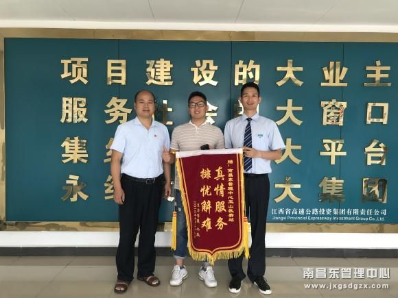 近日,南昌南管理中心玉山收费所迎来一位朱师傅,他将一面绣有“真情服务、排忧解难”的锦旗,交到收费班长吴阳阳手里,感谢吴班长帮助找回他母亲的贵重失物。