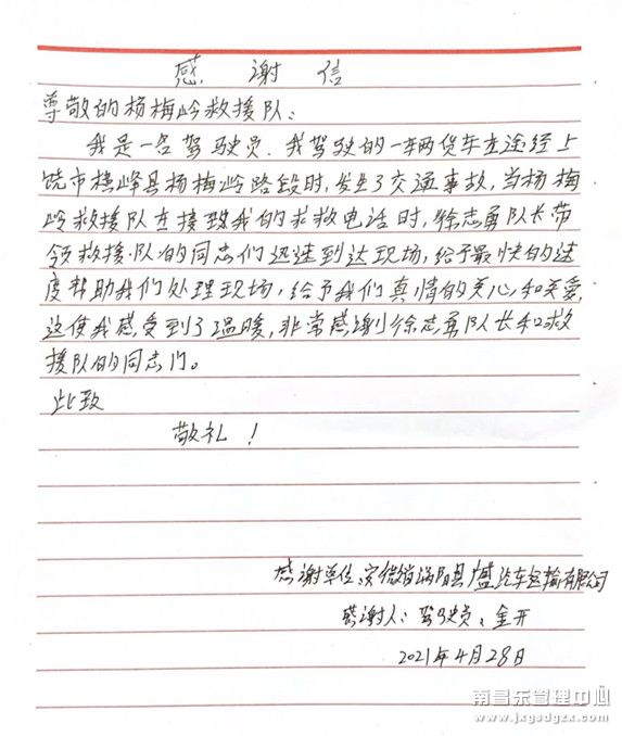 5月10号上午,乐动在线登录官网清障救援队杨梅岭中队接到一个电话,电话那头传来一个声音:“你好,我是上次在你那边发生事故的司机,我现在就在你们停车场门口了,你们过来一下吧!我有东西要拿给你。”该中队队长张永义连忙赶往停车场,看到一辆皖牌大货车停在停车场门口,两位中年人在那等候,手上拿着一面锦旗和一封信,热情地握住张永义的手说道:“太感谢你们清障人员那天的热心帮助,这次正好路过这里,想当面再说一次谢谢!”