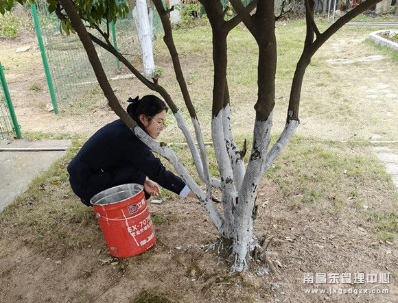 暖阳下,大家分工合作,有条不紊地忙碌着,刷子有节奏地挥舞着,为了确保涂白的高度统一,大家严格测量树干涂色高度,统一控制在离地1.2米左右。整个过程中,每位员工都一丝不苟地完成本职工作,甚至顾不上沾溅到衣服和鞋子上的石灰。经过一个多小时的共同努力,院区树木的底部很快被均匀涂抹上了白色“保护霜”,刷好的树木整齐划一,犹如穿上了一件件雪白色的防寒衣,形成了一道靓丽的风景线。