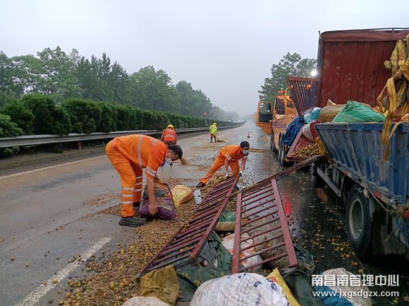 4点35分,天空下起了大雨,由于大部分金桔的包装破损,导致金桔散落面积较大,为了尽最大的可能挽回吴师傅的损失,救援人员头顶大雨一边利用铁锹拾起金桔装入转货车,一边等待吊机抵达现场。50分钟后,吊机将货车扶正,由大型拖车将受损严重的货车拖至玉山中队停车场。救援人员则继续使用工具清理散落一地的金桔,一直忙到临近11点,现场全部清理完毕,高速路面恢复正常通行。