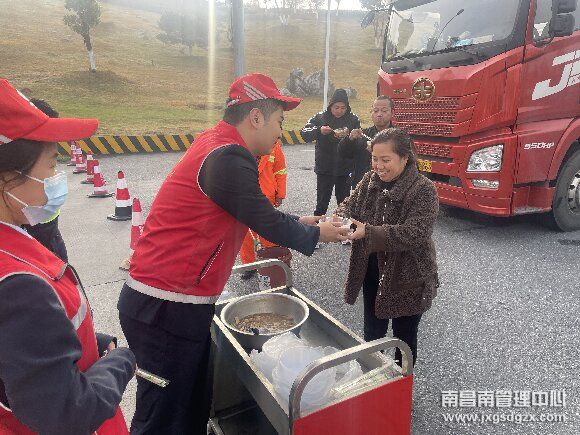 面对大量滞留司机,该站“高速映山红”志愿服务队第一时间组织人员开展“热乎早餐暖寒冬”志愿服务。工作人员不仅为司乘们送上方便面、热水等简易食品,还送上了上饶地区的特色小吃饭麸果,不少司乘表示机缘巧合之下还能品尝到特色小吃,本来心里的郁闷都瞬间烟消云散了。