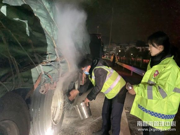 1月26日18时43分,春运当日,南昌南管理中心樟树东收费站值班站长和同事在巡查期间,发现一辆六轴的大货车停在距离出口100米处,该车后轮浓烟滚滚,散发出一股刺鼻焦味,随即带上灭火器并组织人员赶往现场。