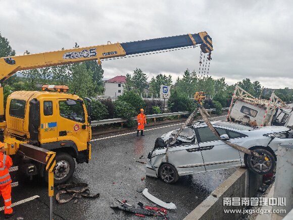 6月24日15时左右,在上海方向沪昆高速K555公桩处,一辆运载着总价值约500万的10辆新车的轿运车发生事故,造成后方严重拥堵,南昌南车辆救援大队杨梅岭中队立即赶赴现场救援,成功恢复路面安全畅通。