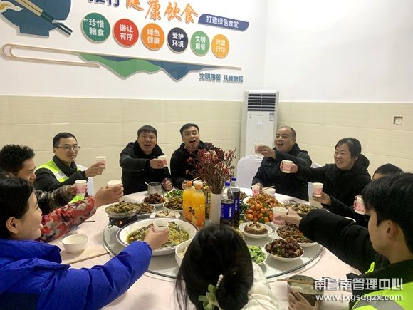 时间在忙碌中悄然流逝,转眼间夜幕降临。车流量渐渐减少,坚守岗位的工作人员(除坚守在岗亭的人外)也陆续回到了食堂。此时,食堂里已经弥漫着饭菜的香气,那是家的味道,是大家对新年的美好期许。桌上摆满了大家齐心协力做出来的菜肴,每一道菜都承载着不同的寓意和祝福。有象征着年年有余的清蒸鱼头,鱼头被煎至金黄,浇上鲜红的剁椒和白色的蒜蓉,色泽诱人,让人垂涎欲滴;寓意团团圆圆的八宝饭,圆滚滚的红枣嵌在饭中,四五枚葡萄干在饭中央晶莹剔透,一盘饭热气腾腾,仿佛在诉说着工作人员们对团圆的渴望;还有寓意着新的一年节节高的藜蒿,鲜嫩的腊肉片伴着一寸长的藜蒿,散发着诱人的香气……